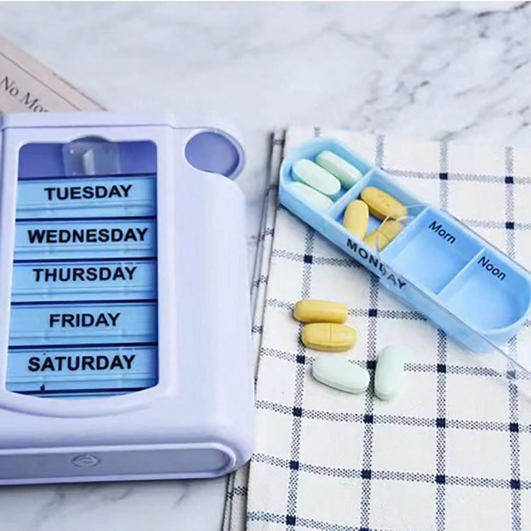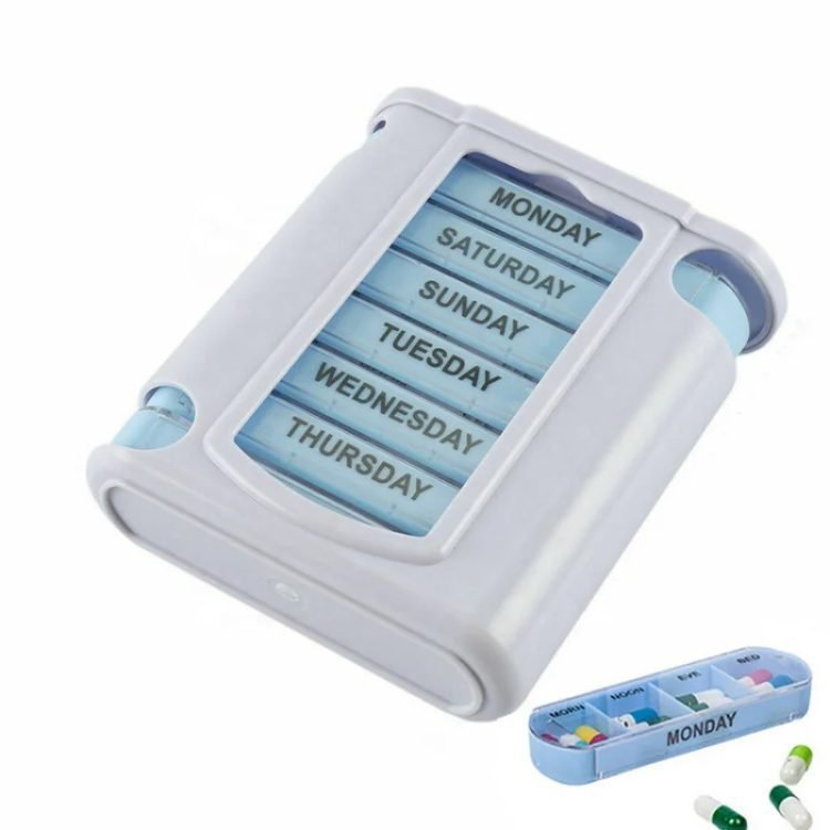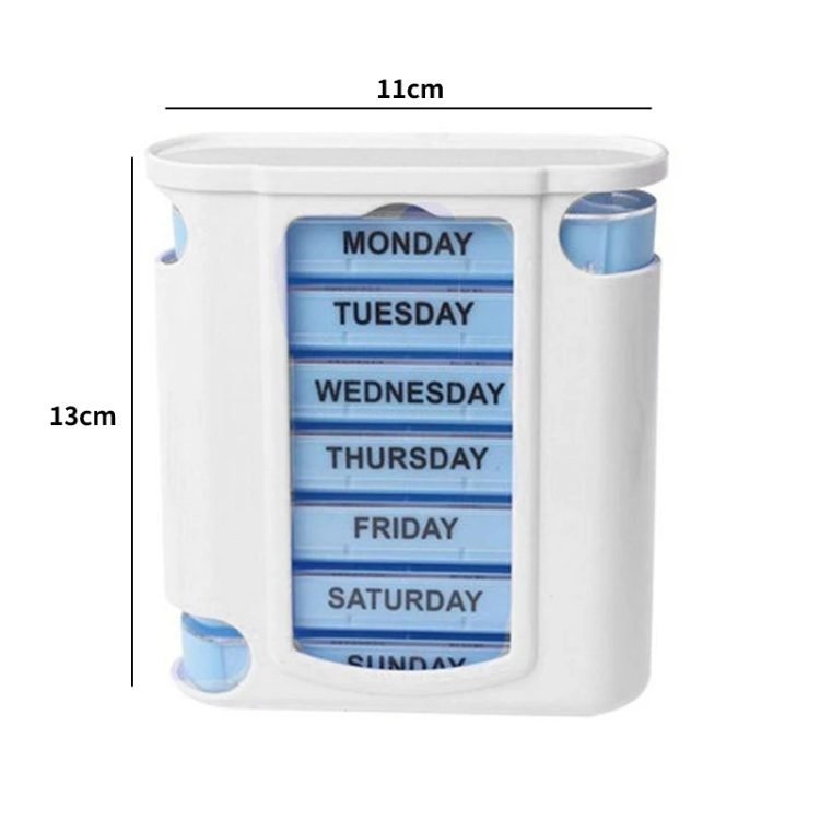 Contains 7 transparent, removable pill/modules/cases (organizers) marked with the days of the week