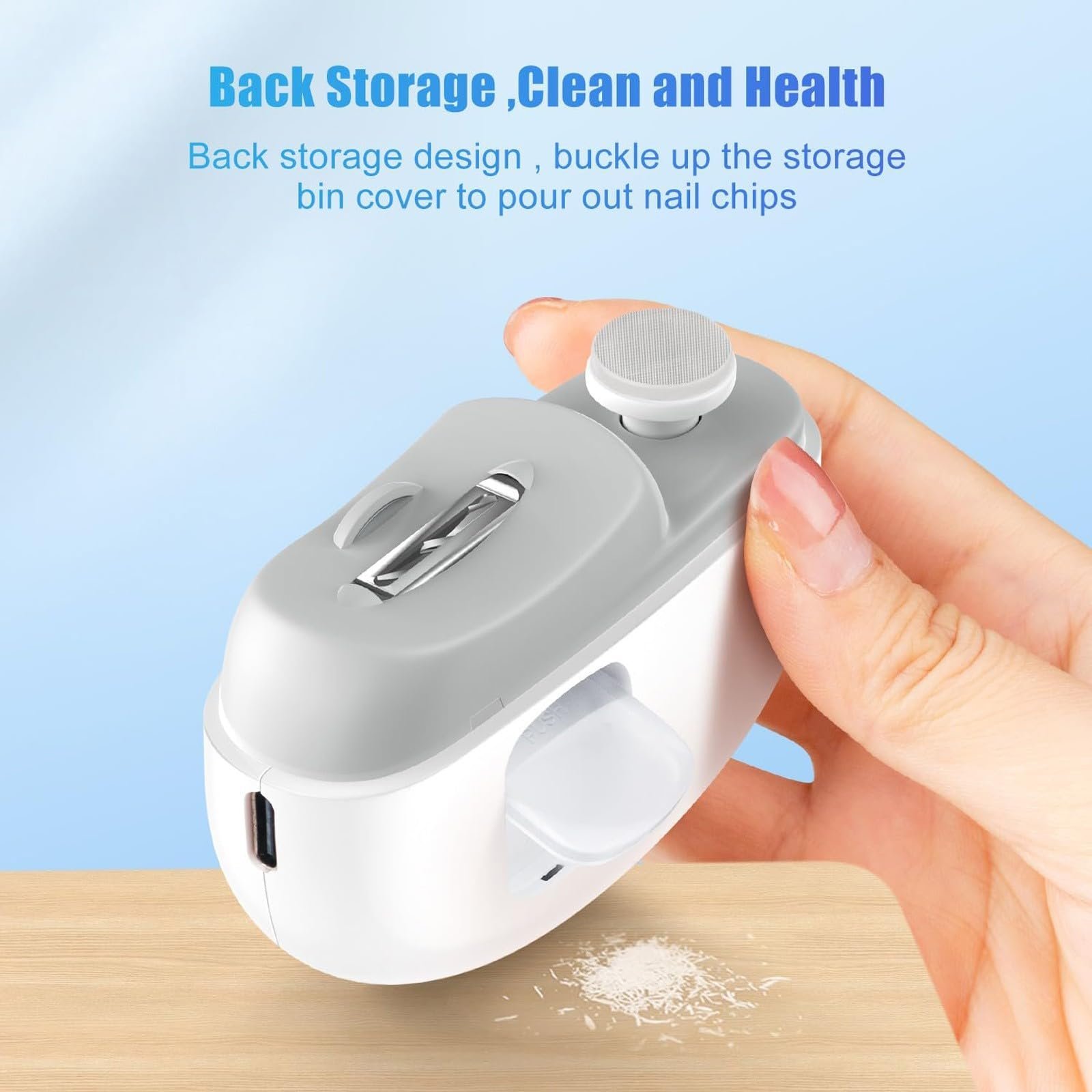 - The automatic nail clipper has a built-in chip storage box, which can be automatically stored after trimming nails, so you won’t have to worry about clipped nail fragments flying everywhere, and then you can quickly and easily clean it by rotating the button to dump the nail clippings, you can use this electric nail clipper anywhere.