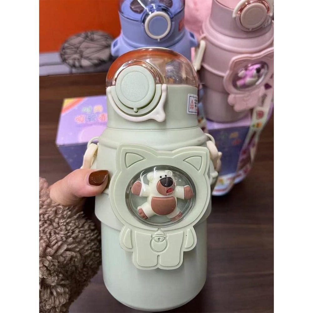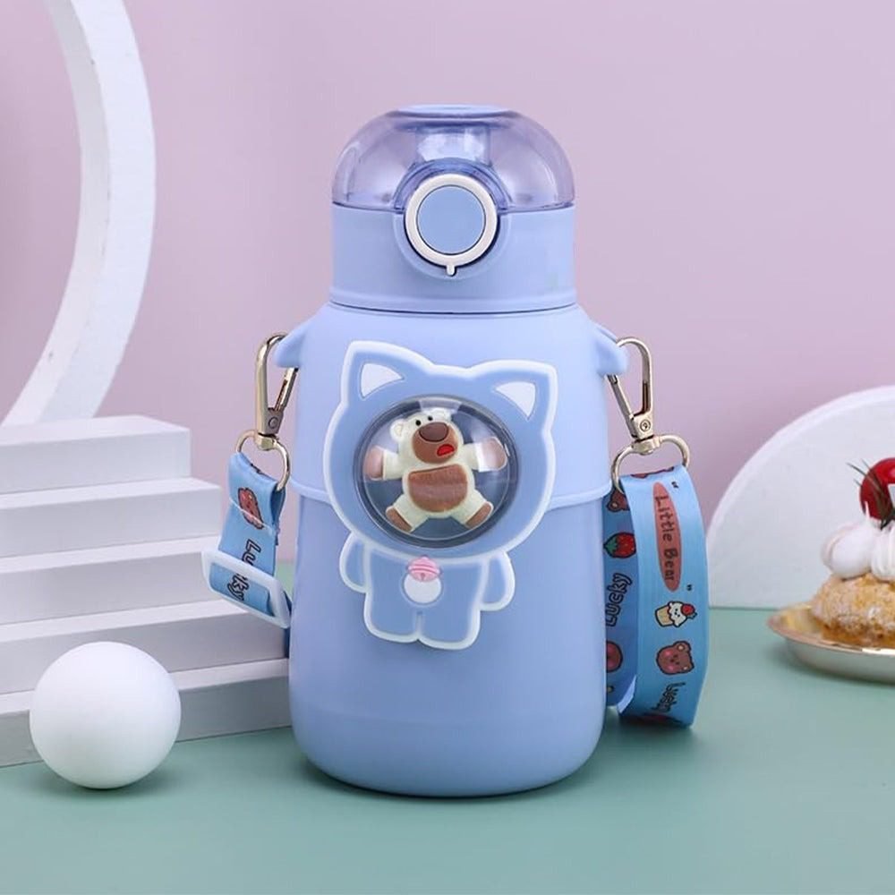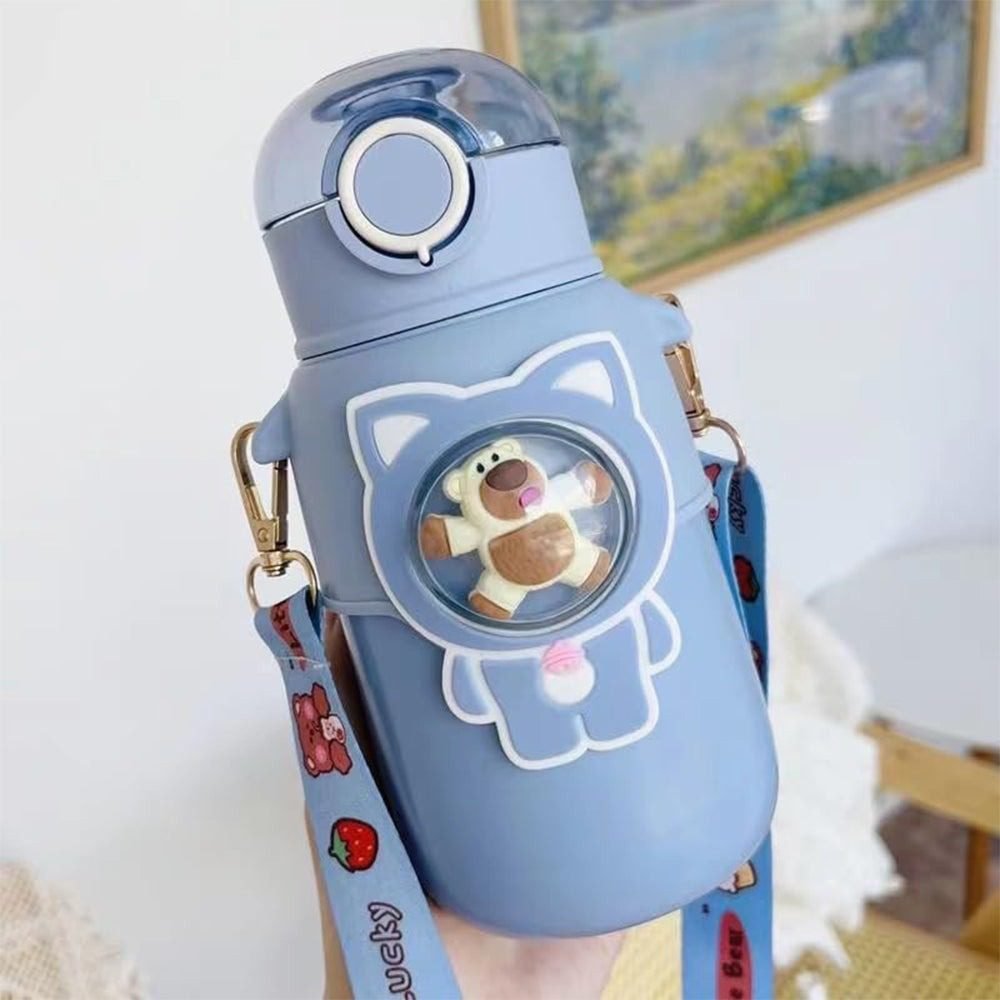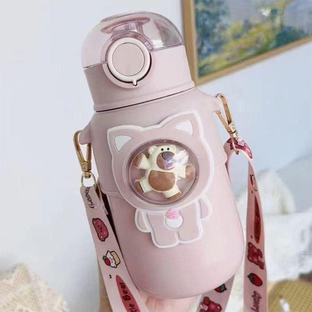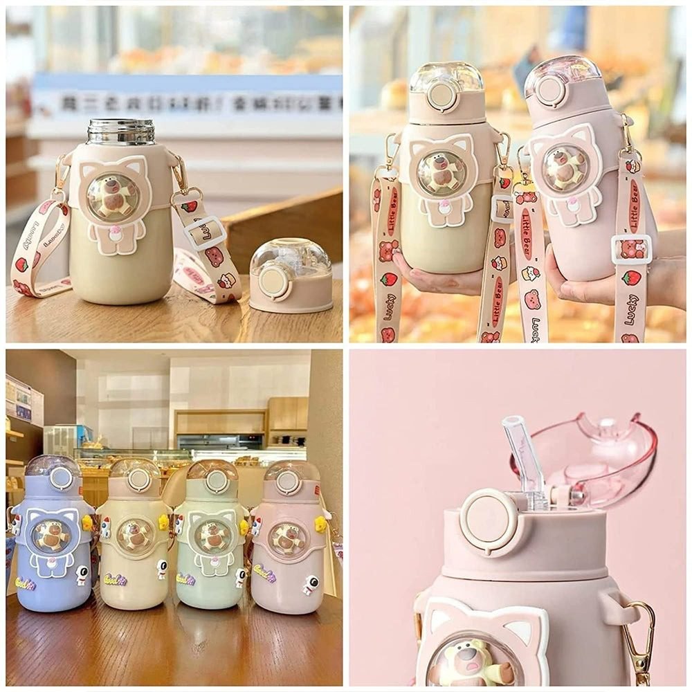 - Cute water bottle with silicone straw, perfect for kids; adjustable shoulder strap for easy portability; built-in silicone seal in the lid to prevent water leakage