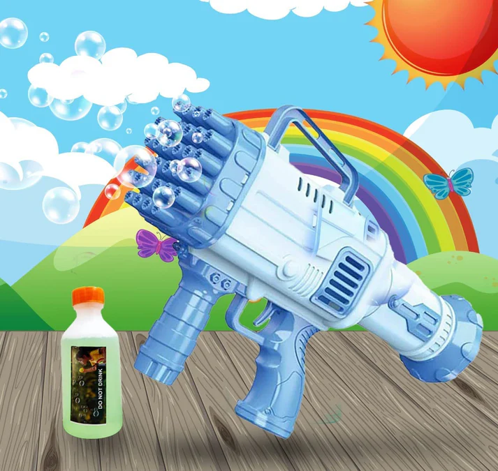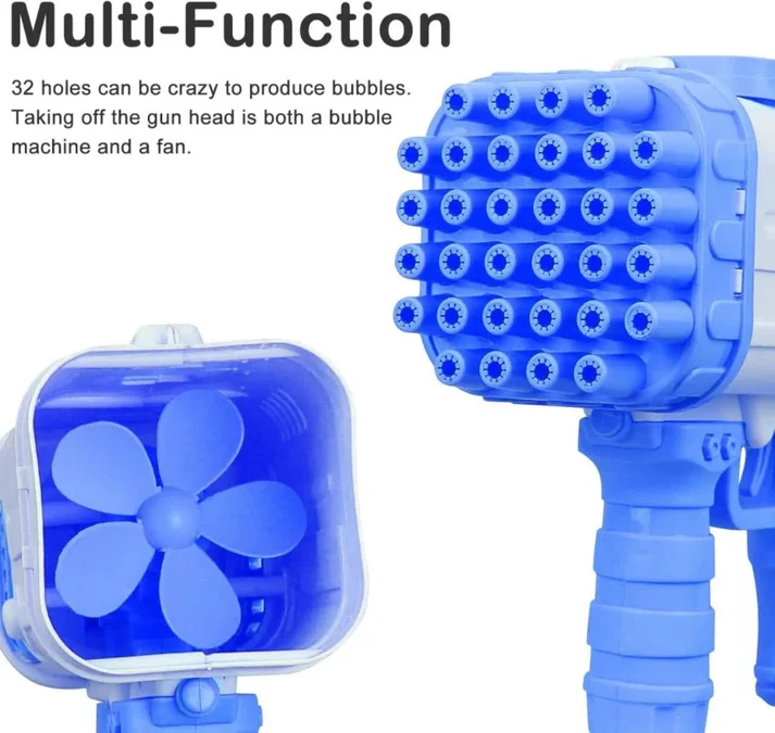 - The Bubble Gun has 32 holes, blowing thousands of colorful bubbles every minute and has no water leaking and no overflow design.