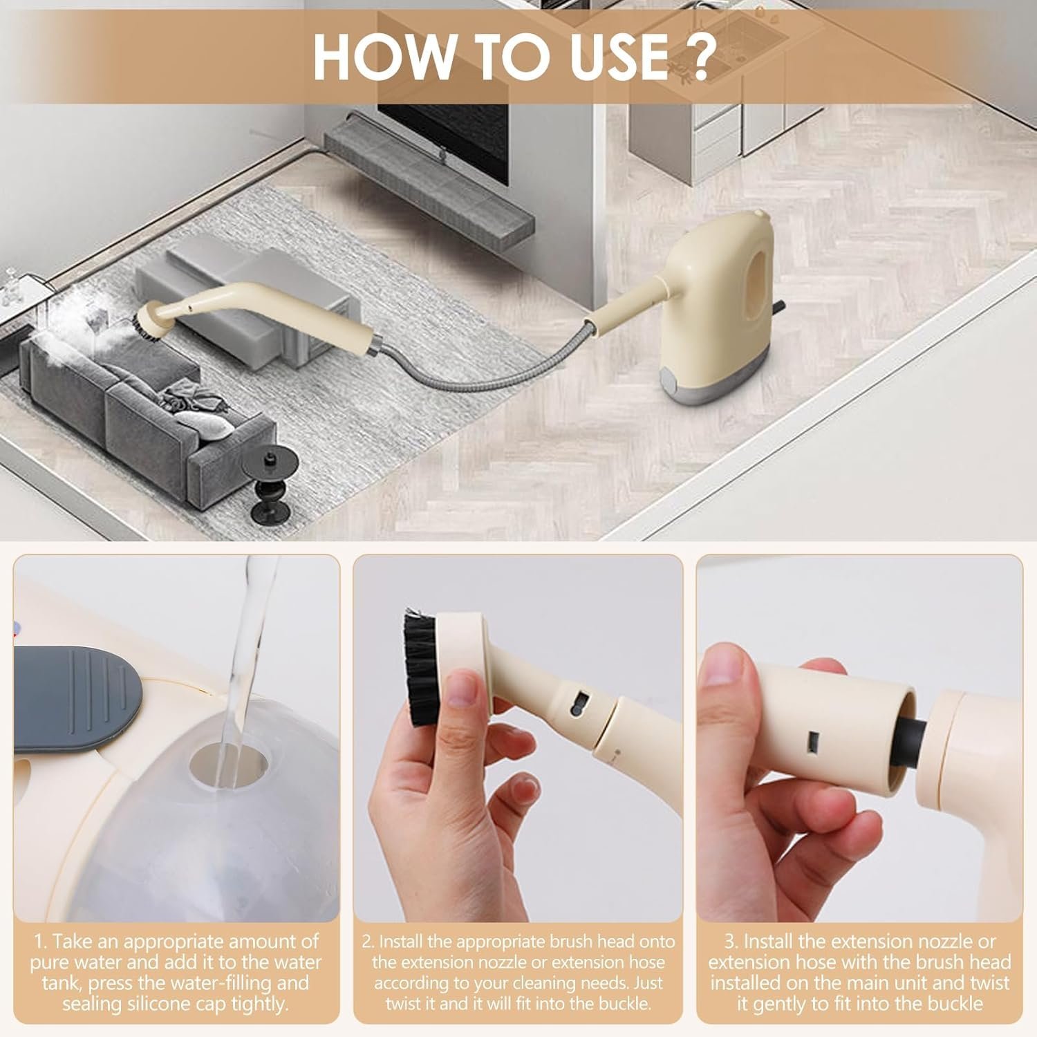- 【Versatile Steam Cleaner】The steam cleaner contains 8 replacement accessories: flexible extension nozzle, brush body, small steel brush head, straight nozzle, towel cover, soft silicone scraper, small brush head, steel wool. You can use it in a variety of scenarios: cleaning the kitchen hood, cleaning old stains in the bathroom, smoothing creases on clothes, etc.