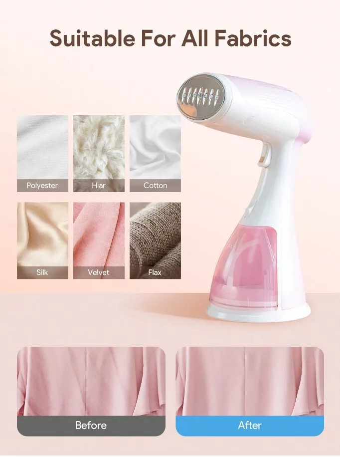 ? 5 in 1 Multi-Functional Clothes Steamer: This versatile steamer offers ironing, disinfection, humidification, and dust removal. It gently works on even the most delicate fabrics and is suitable for all types of materials, effectively killing bacteria and eliminating odors. It can refresh a variety of items beyond clothing, including carpets, curtains, bedding, cushions, sofas, kids’ toys, and more. The system includes a lint remover and refresh brush for added versatility.
