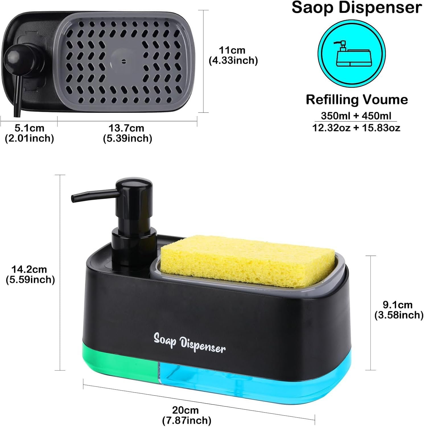 - – 3-in-1 Functionality: Designed with a pump head, sponge holder, and two separate containers for dish soap and hand soap, this dish soap dispenser streamlines and simplifies your cleaning process with efficiency and organization. No more cluttered countertops or searching for soap!