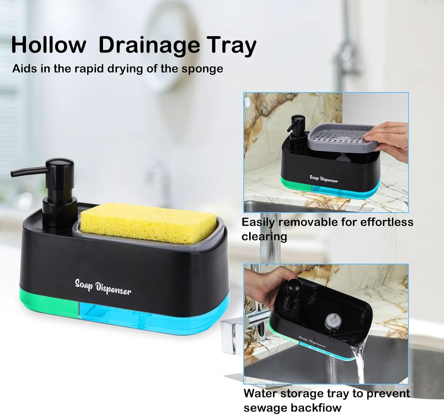 - – Drainage Holes Design: Our hand and dish soap dispenser set features a unique sponge holder with a built-in drainage system. Any excess water will drain out through the holes, preventing water build-up and ensuring a dry and clean countertop. Cleaning up is a breeze, too – simply remove the sponge holder and pour out the excess water.