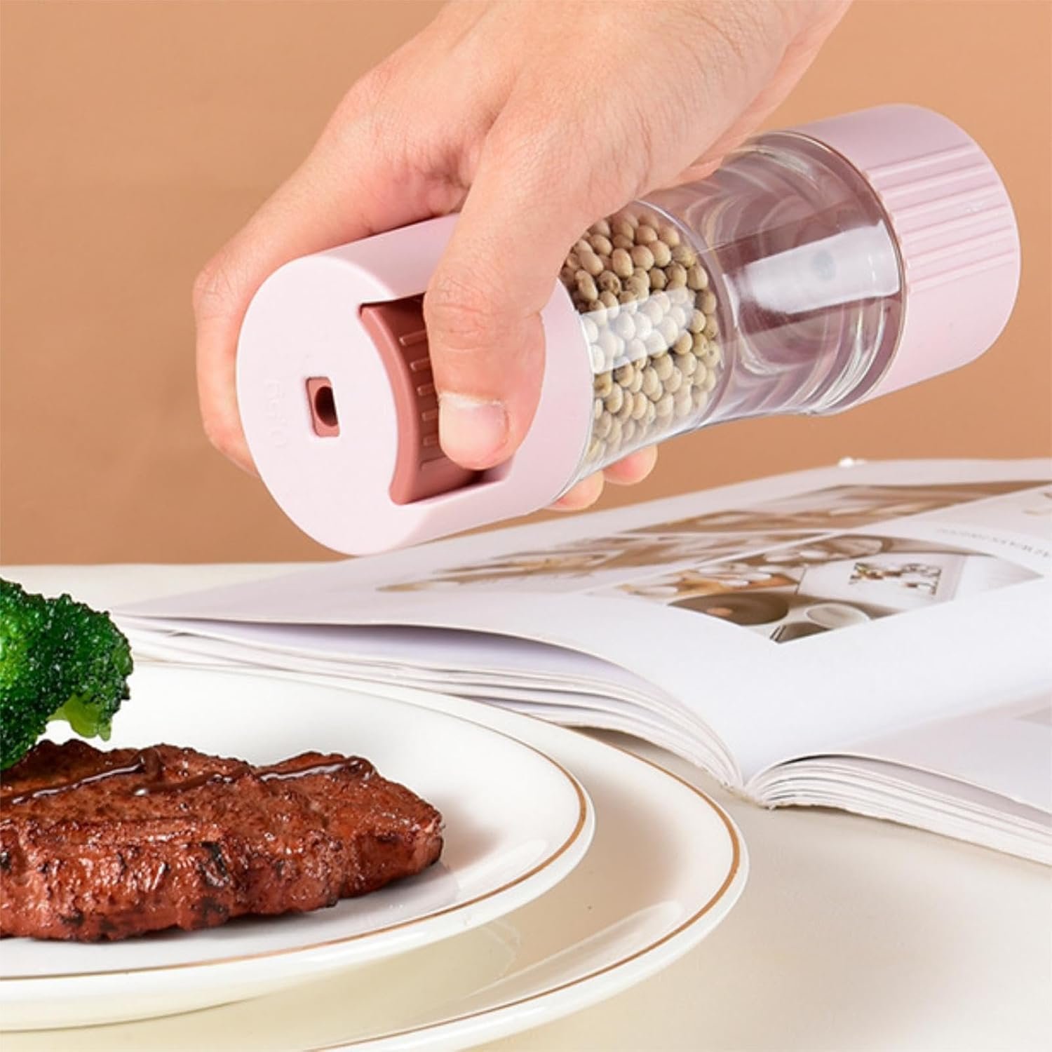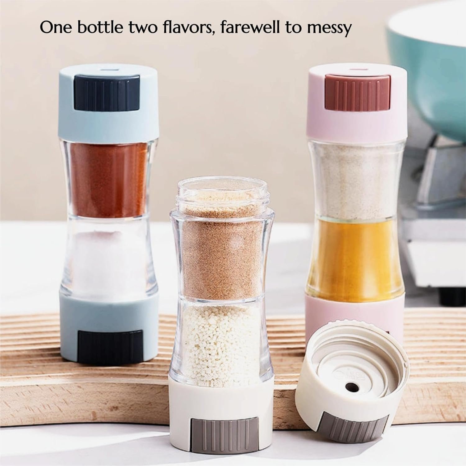 - DOUBLE HEAD DESIGN: This salt and pepper shakers innovative dual-end design provides generous storage space for herbs, spices, curry, baking supplies, and other kitchen essentials. Say goodbye to cluttered seasoning jars! With this salt shaker double-layer design and built-in bottle cap, it effectively prevents ash and oil fumes from contaminating your kitchen, ensuring a clean and hygienic environment.