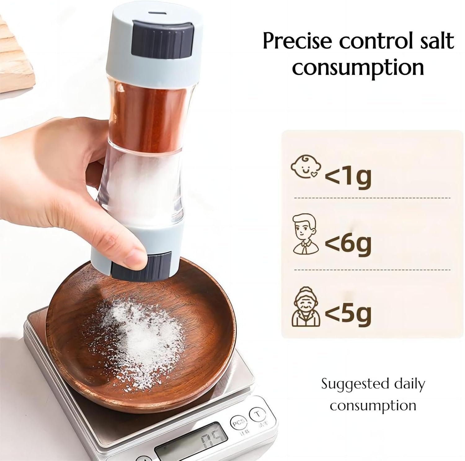 - CONTROLLED INTAKE: This salt and pepper set quantitative button enables precise discharge, with each press releasing 0.5 grams of seasoning. This allows for accurate control of salt intake, which should not exceed 6 grams per day. Perfect for the elderly, pregnant women, babies, and fitness enthusiasts.