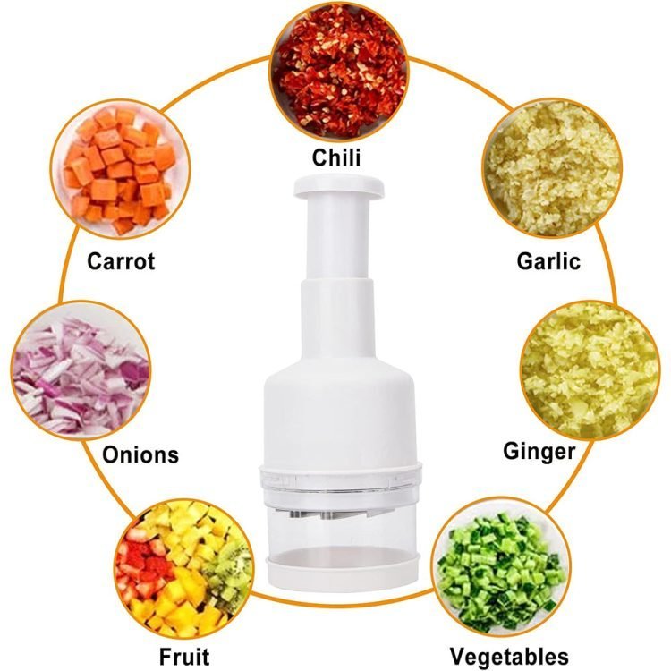 2. This manual food chopper can chop different vegetables easily and quickly by pressing, which is a perfect tool for kitchen. Vegetable chopper adopts multi layered design, which is easy to disassemble and clean, so you can use it with confidence.