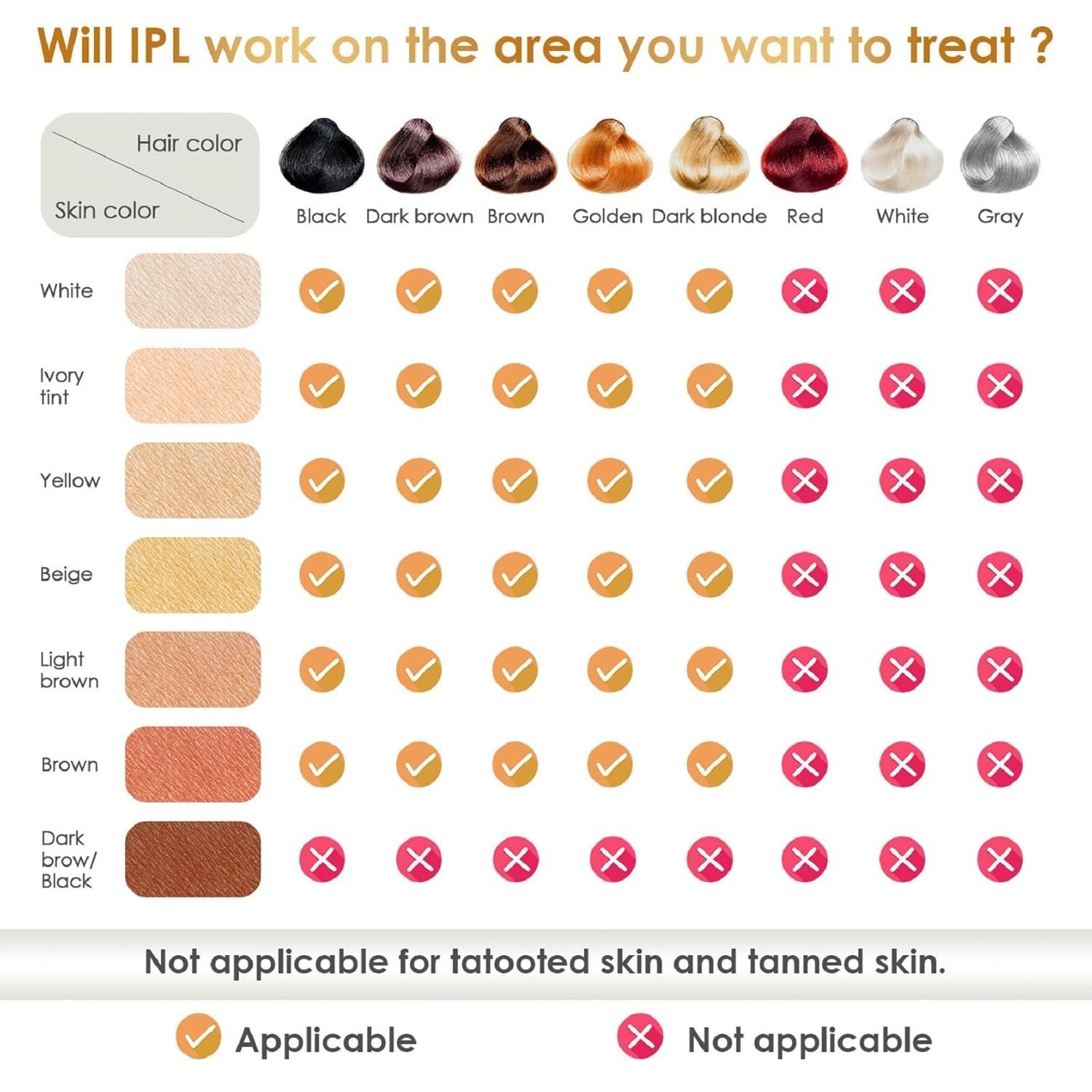 - Note:The hair remover can’t be charged. It needs to be plugged into power to use. It is recommended to start the test from the first gear. You can increase the gear according to the adaptability of your skin. PLEASE DO NOT use this product on the tattoo, scar, acne, mole, injured, or recently tanned skin. Not Applicable:Brown/Black Skin. Please check the skin tone chart and hair color chart before buying to confirm whether you are suitable for hair removal device.