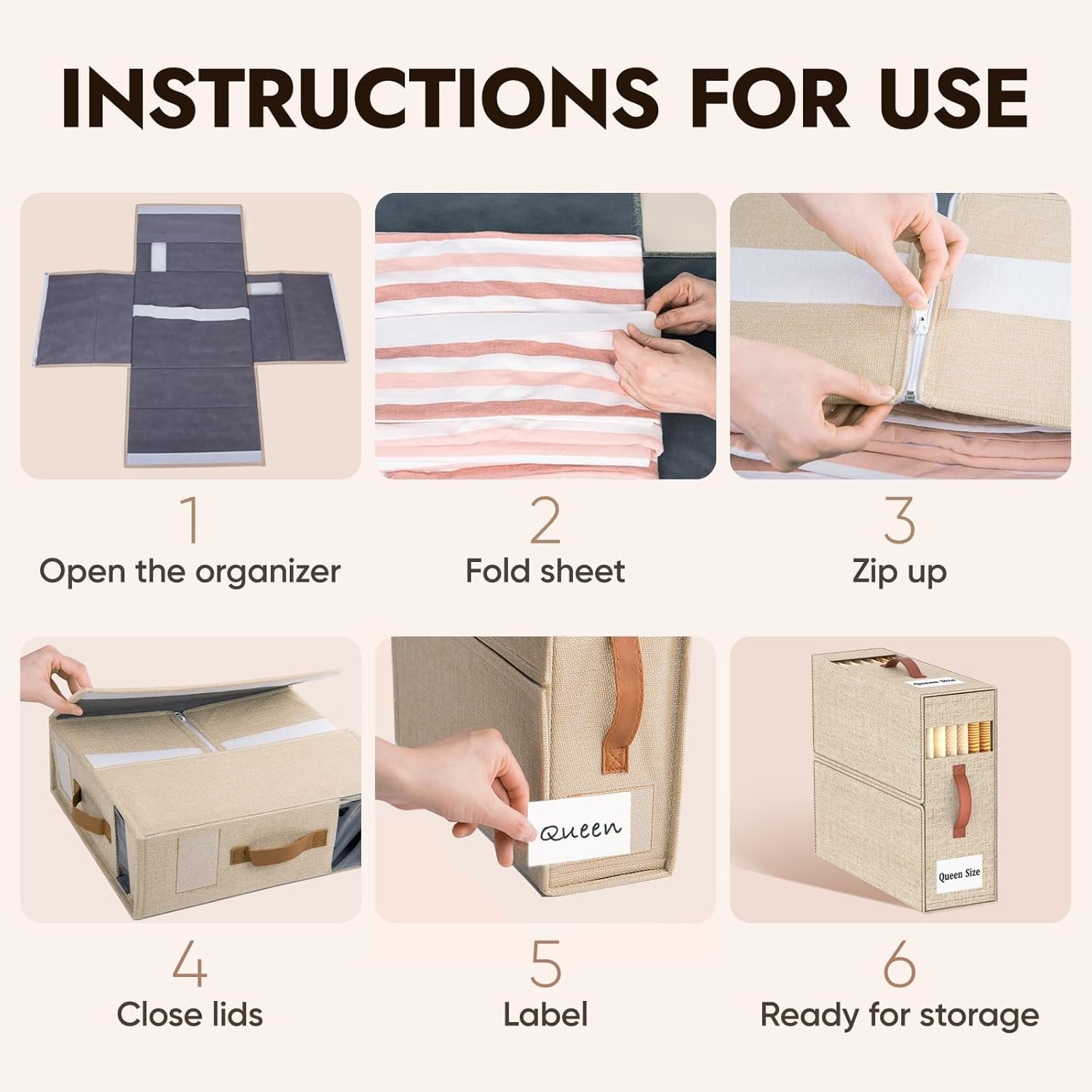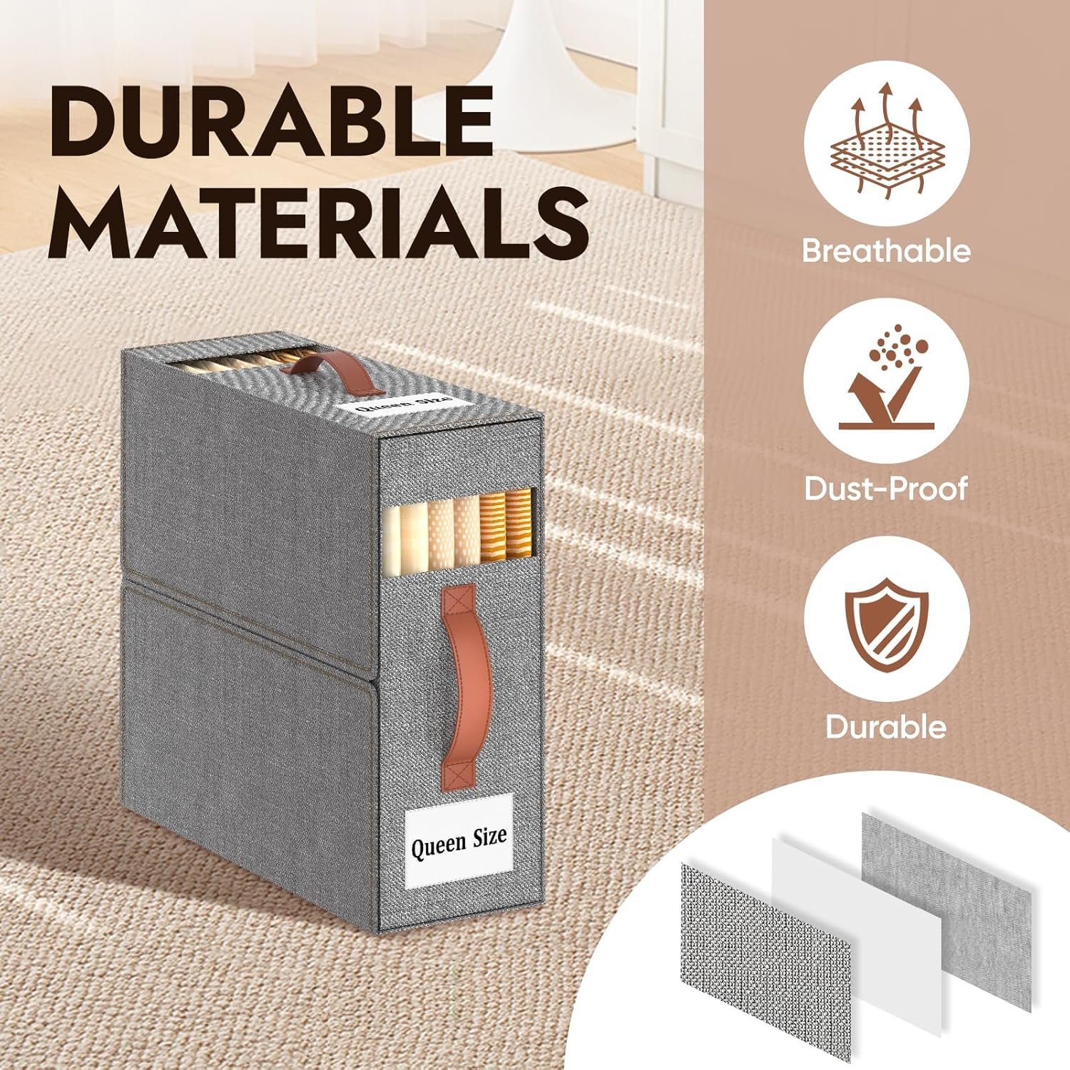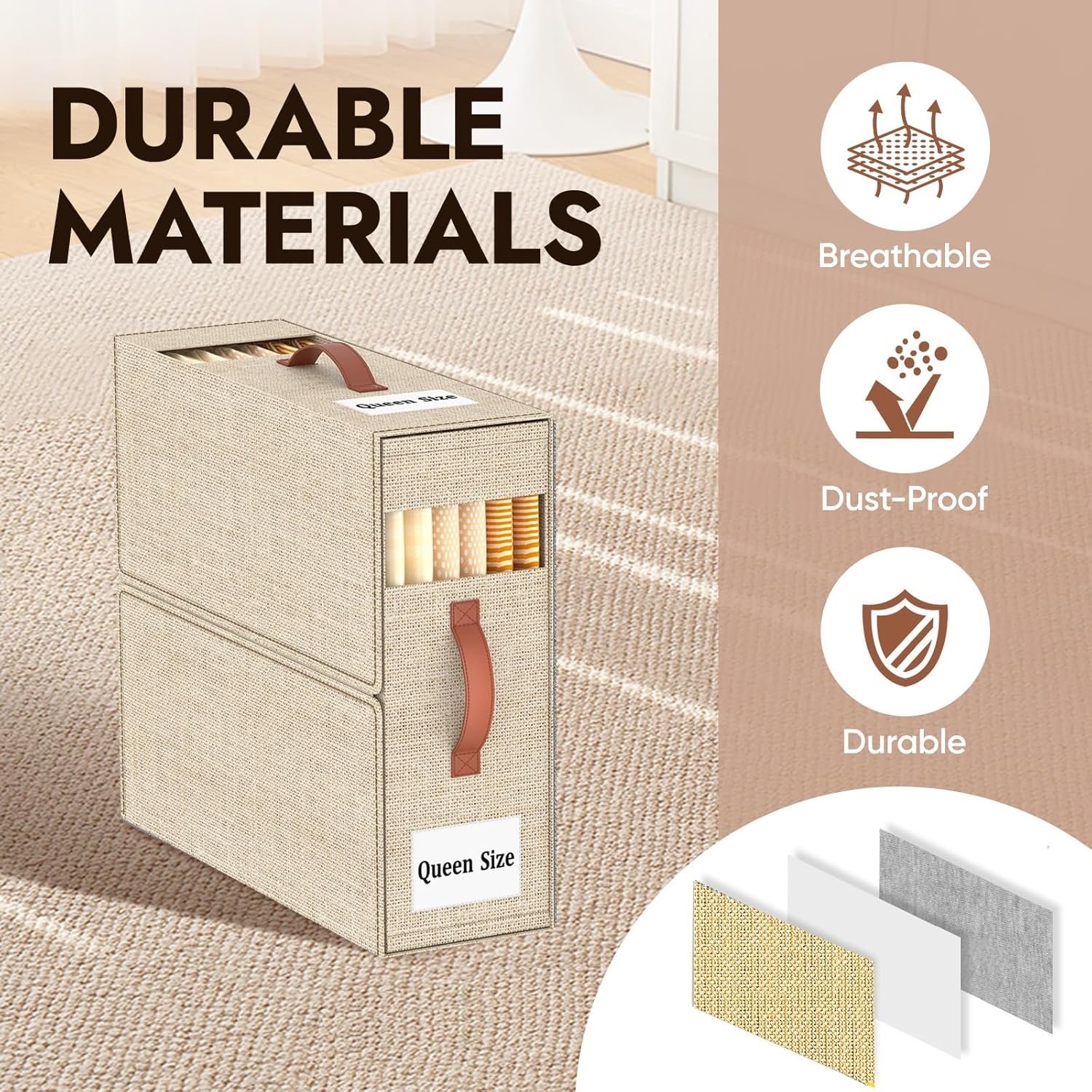 • ?ECO-FRIENDLY MATERIAL? Our bedding organizer is made of 3-layer linen fabric to make the product breathable, dustproof, and durable. We use the plastic board instead of cardboard inside to keep its shape, so the product is odorless and could be rigid even it is empty.