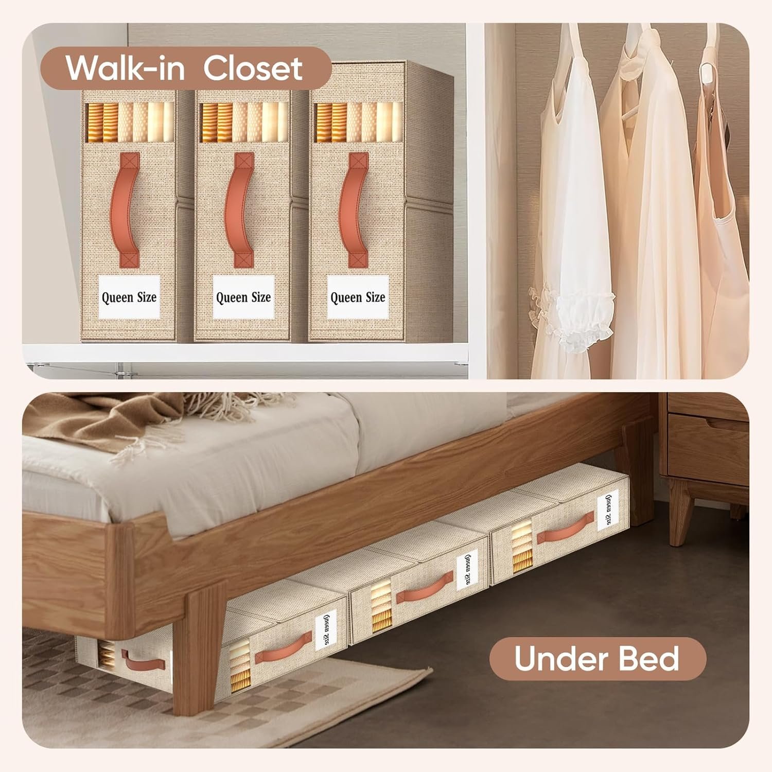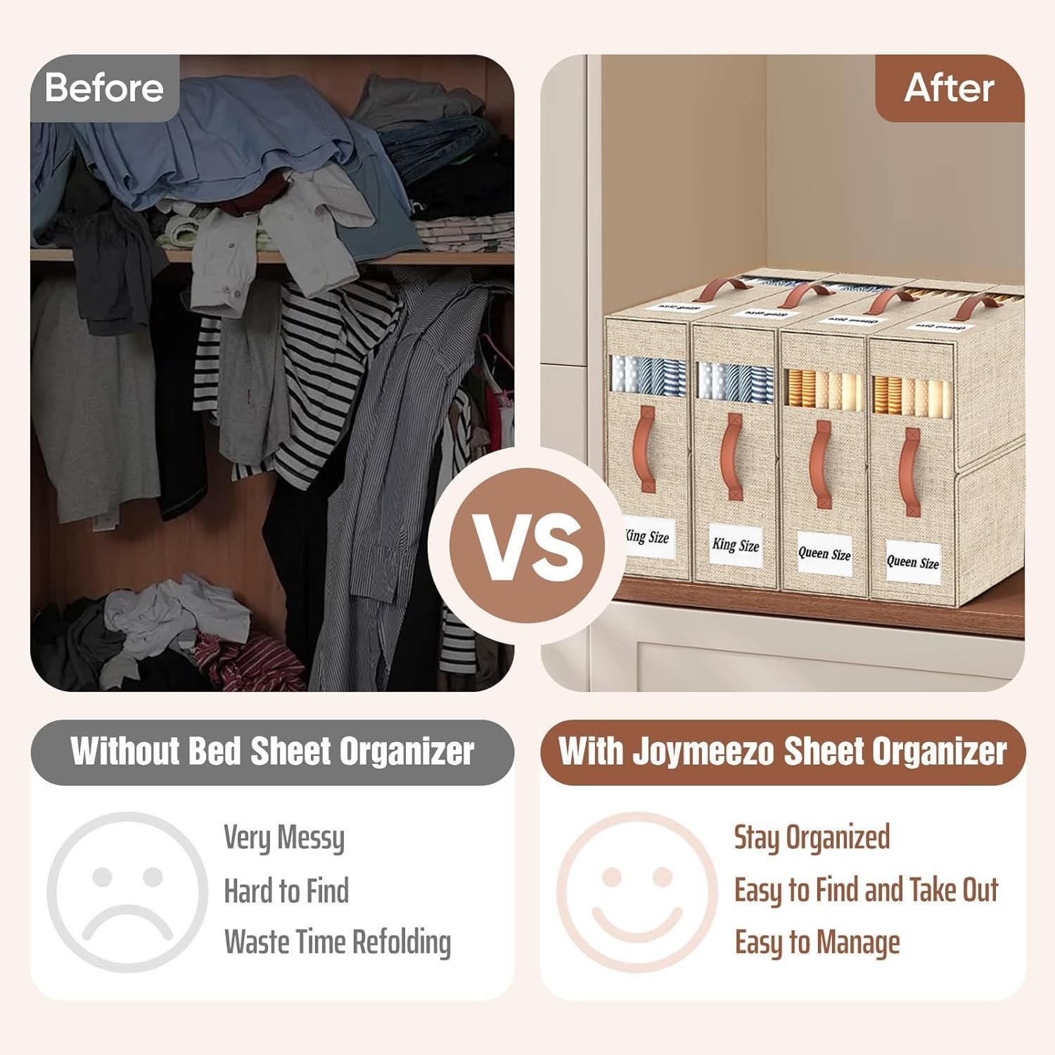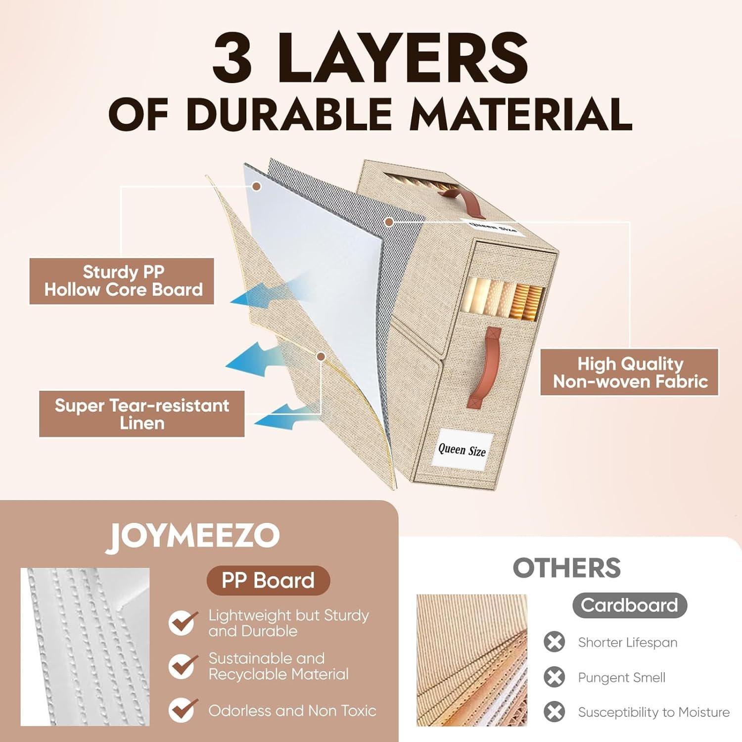 • ?ECO-FRIENDLY MATERIAL? Our bedding organizer is made of 3-layer linen fabric to make the product breathable, dustproof, and durable. We use the plastic board instead of cardboard inside to keep its shape, so the product is odorless and could be rigid even it is empty.