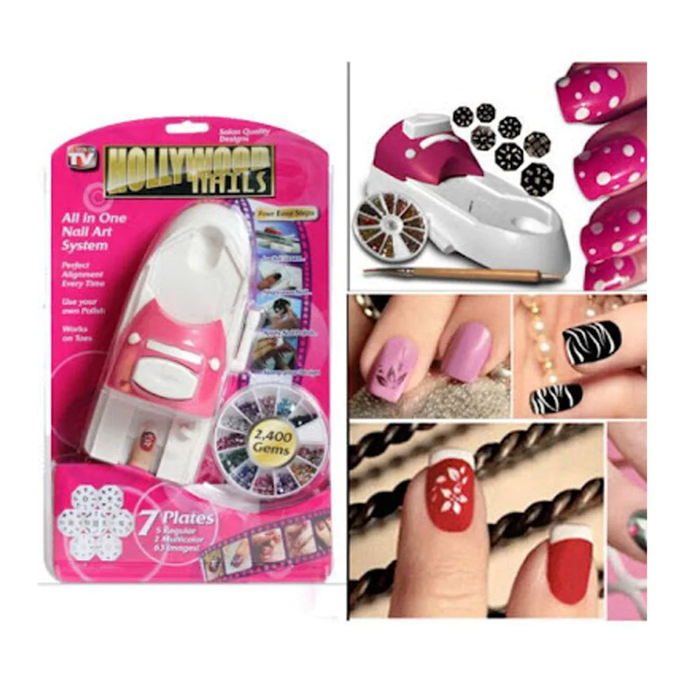 Easy, affordable, do-it-yourself nail designs. Create fun and trendy nail art at home with this simple, all-in-one design system. The supportive hand-steadying base holds your finger – or toe – in place while you paint your nail and stamp on the design of your choice, ensuring perfect alignment and salon-quality results every time. The kit includes seven plates with over 60 chic designs, a professional nail art tool, and 2400 rhinestones for that extra bit of sparkle and bling. Polish not included. Plastic/metal, 8”L x 3”W x 13 3⁄4”H.
