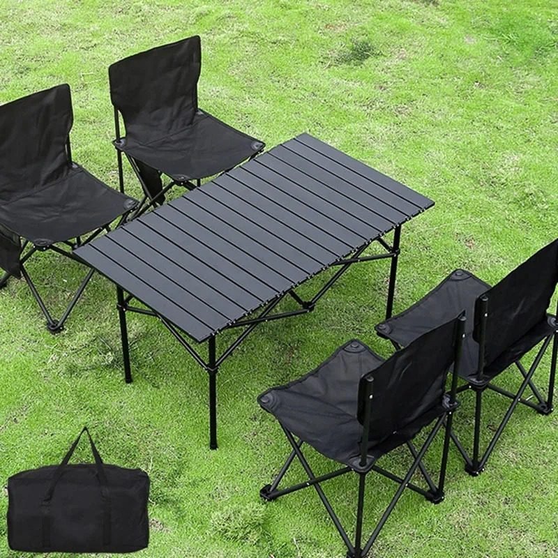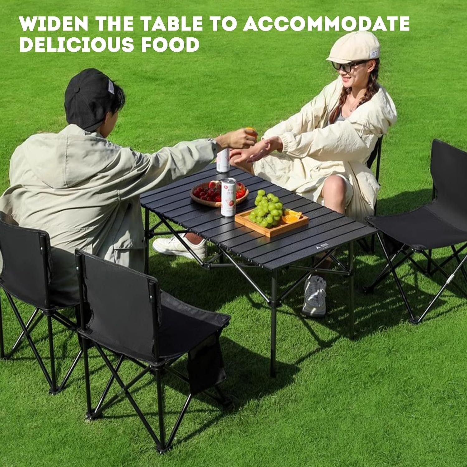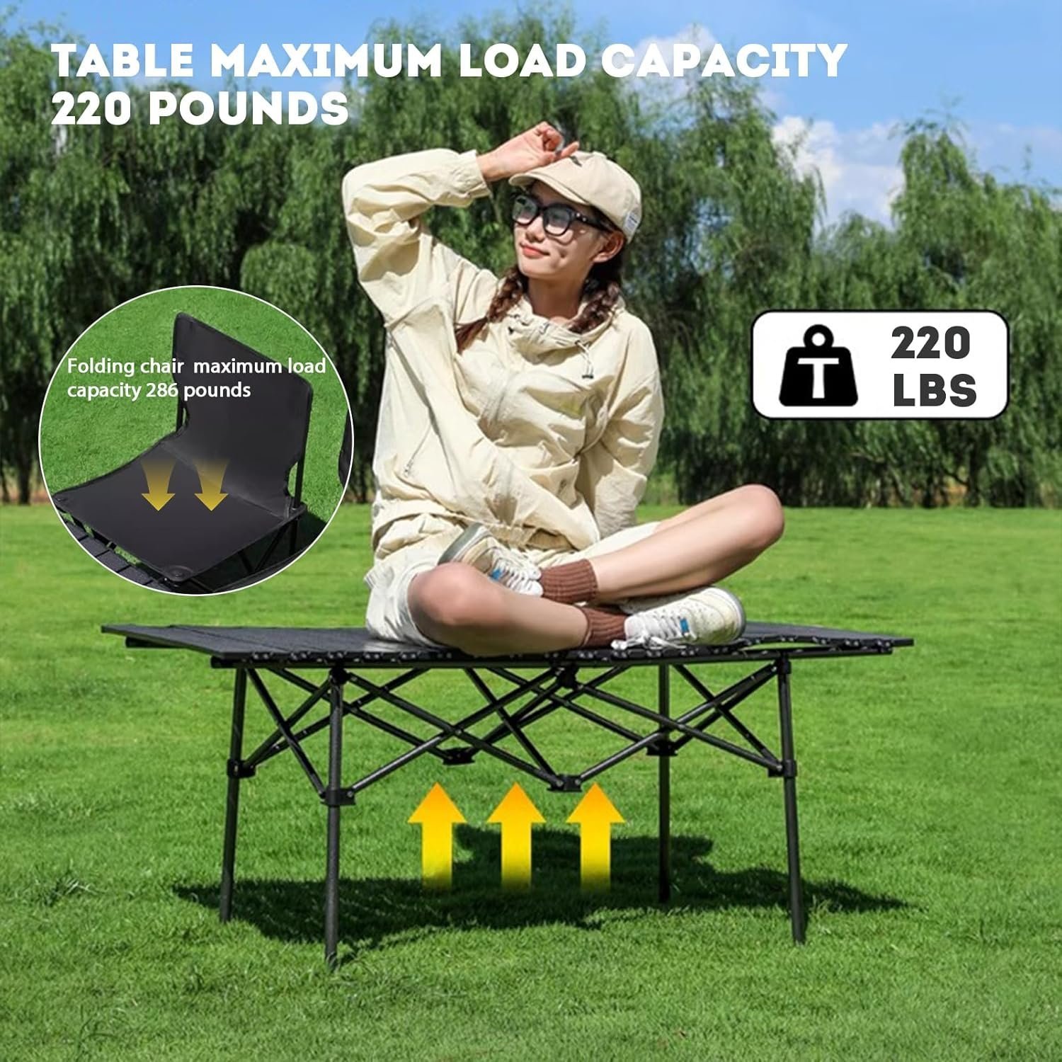 - Durability: This Camping Table has a sturdy aluminum surface that is built to last. Our camping table is stable and durable, supporting up to 220 pounds of weight. This folding picnic table is scratch-resistant and waterproof, making it perfect for outdoor use. The Chairs with Carrying Storage Bag make it easy to store and transport.
