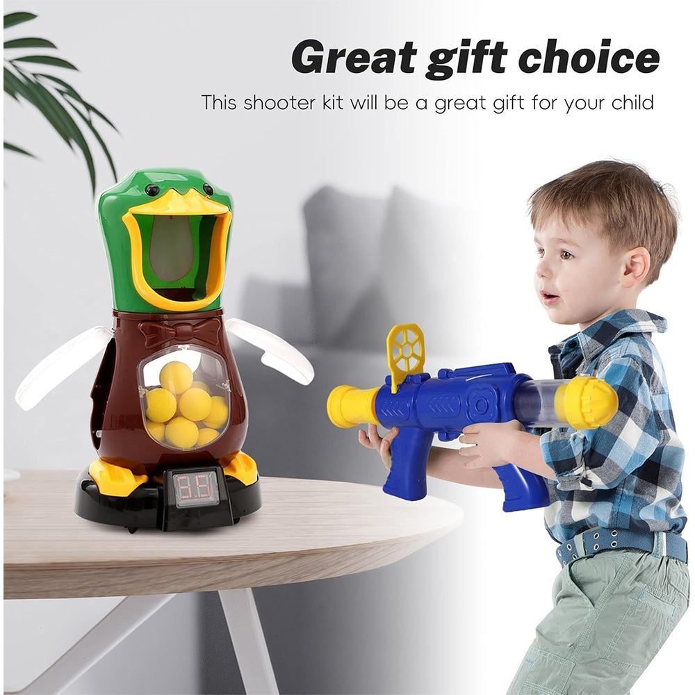 - [Super Value] Shooting Game Kit – EVA foam ball x24, air pump gun x2. Duck target with LCD scoreboard x1, Shooting target need place 2*1.5V AA batteries(Not included). Easy to use, a good toy for family and children to interact. Enjoy family leisure time and find more funny moment with family.