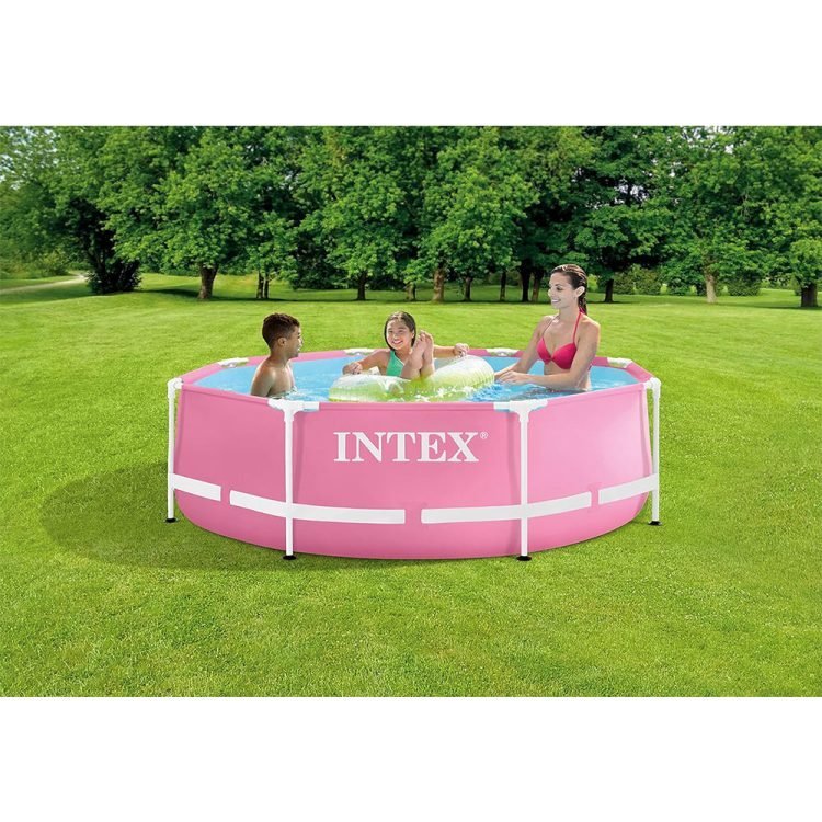 Round pool made of metal frame with durable, three-layer PVC liner in pinkEasy and quick assembly thanks to interlocking grill tubes, ready to use in just 30 minutes