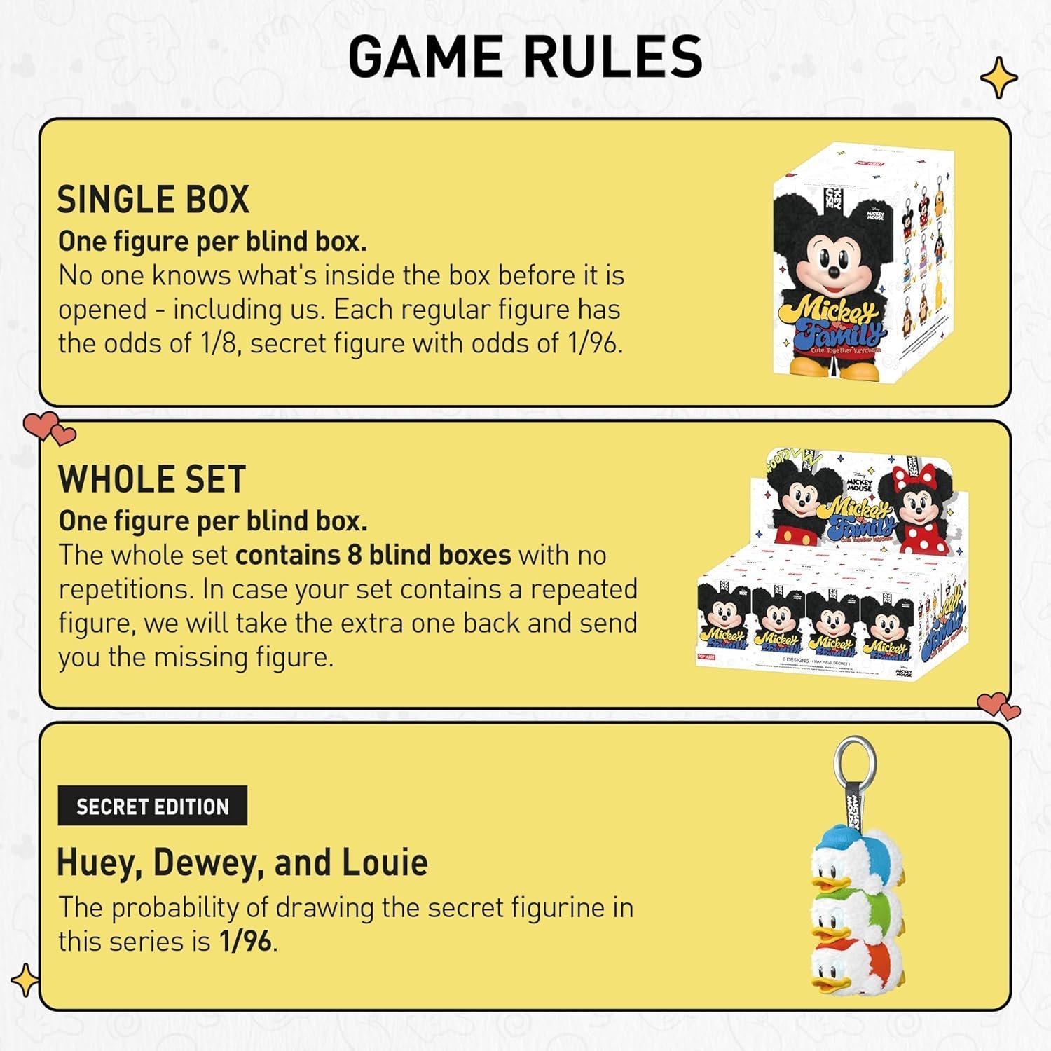- POP MART Mickey Family Cute Together Keychain Series Figures Blind Box: The blind box contains a random figure from a specific series. Each blind box only contains one figure. No one, including us, knows what’s inside. This collection contains 8 blind box figures, one of them might be the secret edition.