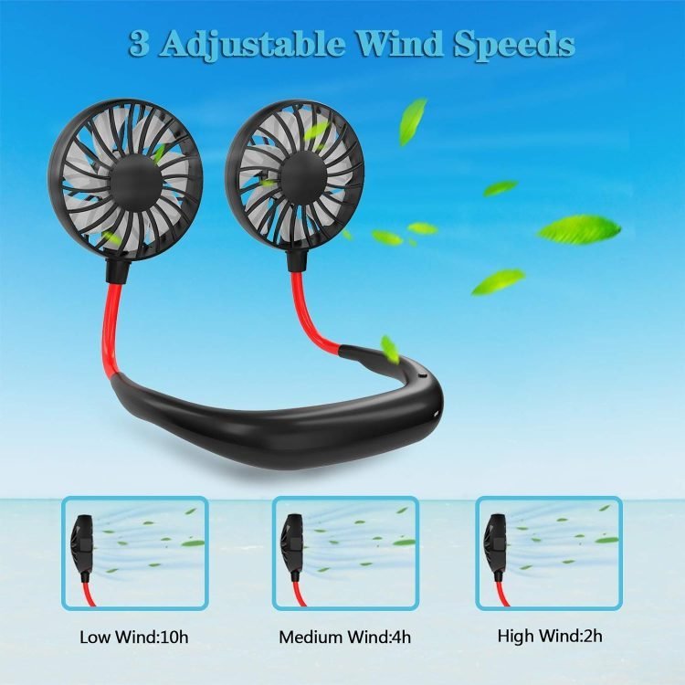- 3 Adjustable Speeds- This Wearable Neckband USB Fan is available with Low / Medium / High speed levels according to your individual needs. Adjust appropriate fan speed by pressing the power button. Say goodbye to hot flashes, sweating, and flushing.