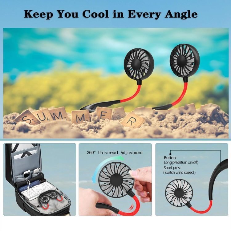 - Hand Free ? HIPTAGE portable sports neck fan is designed as a headphone to free your hands anywhere. The fashion style makes you look so cool. When it sits around your neck, the lightweight comfort and flexibility design will keep you cool and relaxed when you’re outdoors, relaxing at the beach, or reading in bed with quiet support.