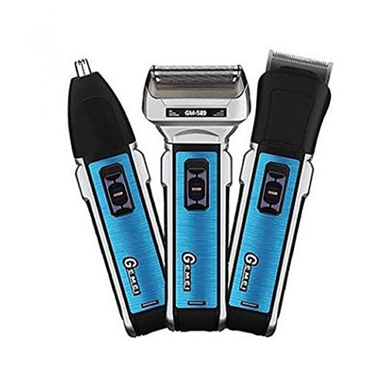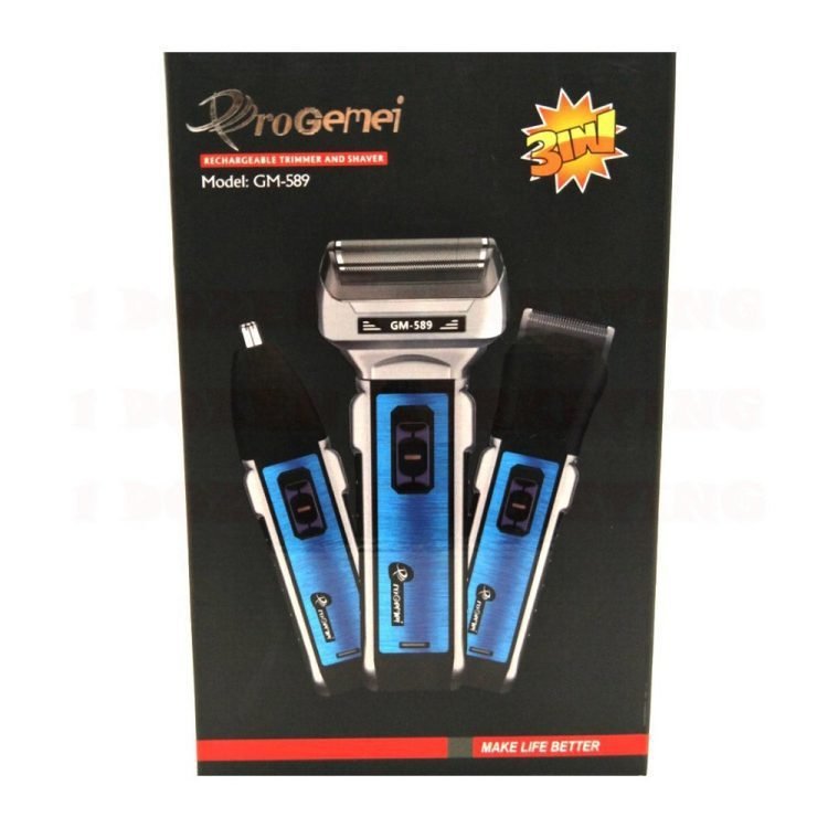 - PROGEMEI 3-IN-1 RECHARGEABLE HAIR CLIPPER TRIMMER AND SHAVER GM589 Features and Specifications: – Brand: Gemei – Model: GM-589 – Voltage: 220-240V 50/60HZ – Power: 3W – Rechargeable: Yes. The Gemei Professional Hair Trimmer is a rechargeable grooming appliance for men – Variable stainless steel blade – After a full charge, it can be used for up to 60 minutes – – – Ceramic blade which can be removed for easy cleaning – Fully Washable Stainless – Steel blade – On/Off Switch – Silver Pd. The motor of high rotational speed – Cleaning Brush – Intelligent anti-clip system – Flexible removable – Pop-trimmer – The cutter head can be arbitrarily changed – Free combination – Rozer, hair machine, push knife – Rozer back with pop-up repair scissors – Counterclockwise rotation of 30 degrees – Upward pull out With charging indicator light