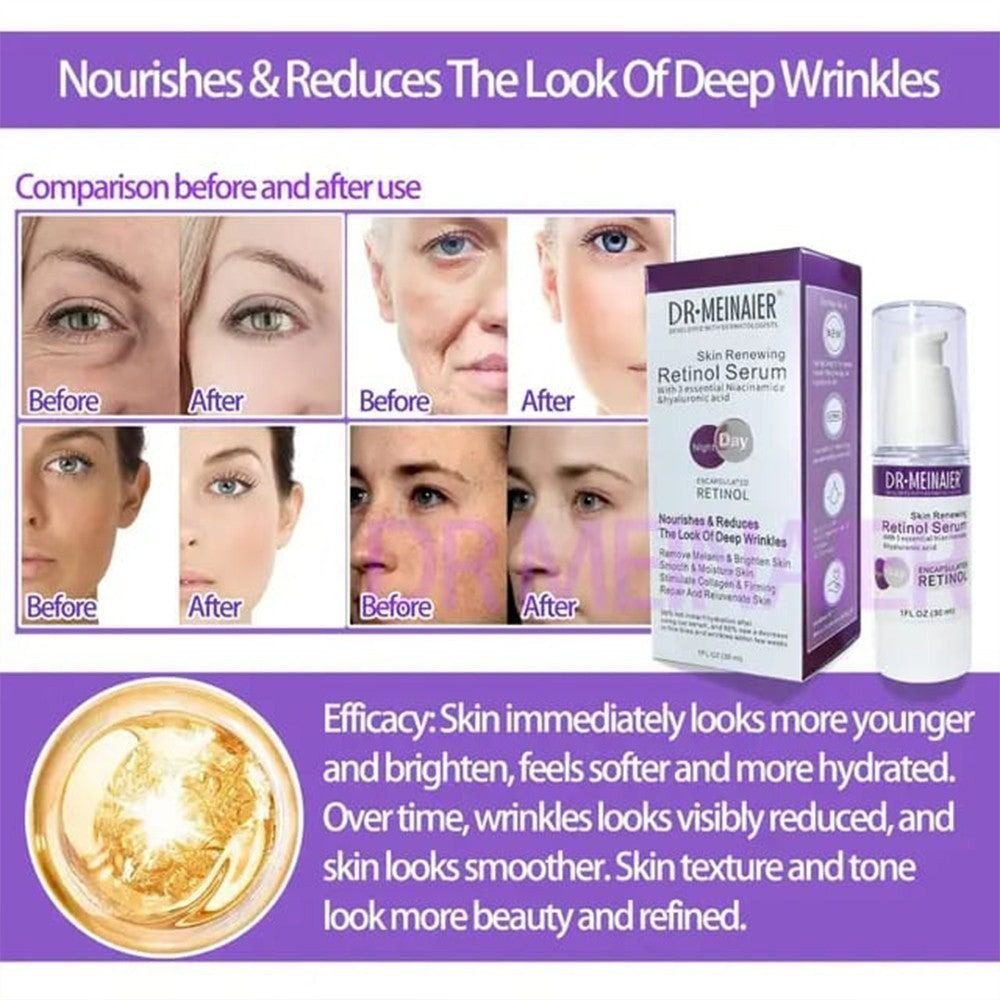 Dr. Meinaier Retinol Serum with Hyaluronic Acid Niacinamide. Hyaluronic Acid delivers intense hydration, leaving skin full and plump. DR Meinaier Retinol Serum Skin Renewing Retinol Serum Fills in sagging skin giving you a full plump look. Also contains super antioxidants Vitamin C and niacinamide to promote collagen build, brighten and fade scars giving your skin vibrant glow in appearance.