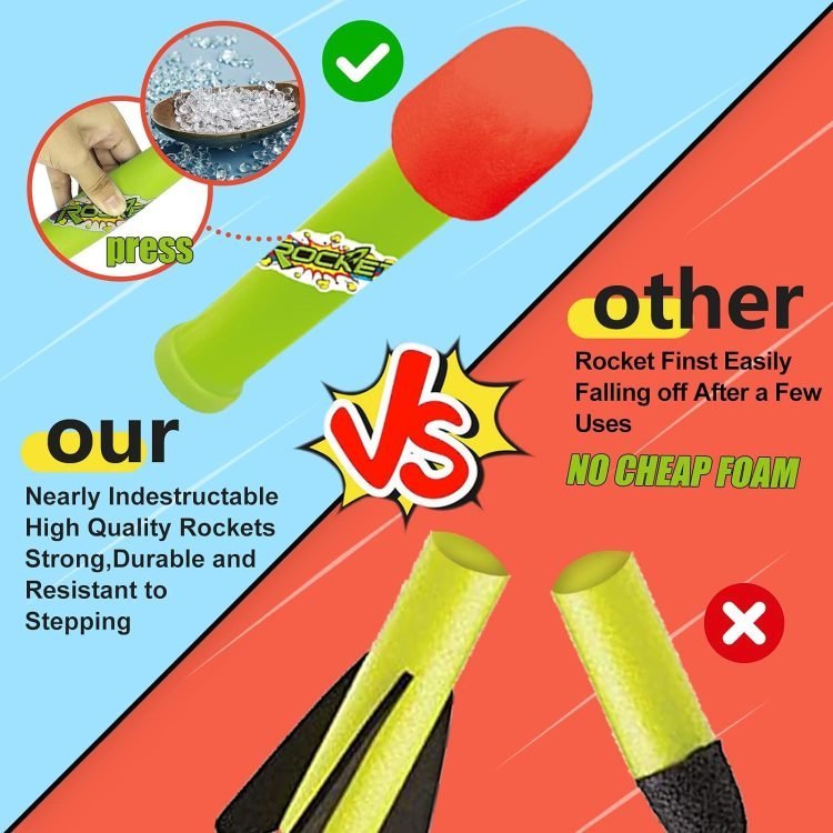 The rocket launcher toy is equipped with a high-quality airbag power unit that can not only withstand countless hours of jumping and stomping, but also provide enough power for the rocket. And the rocket made of foam material provides safety and will not damage anything.