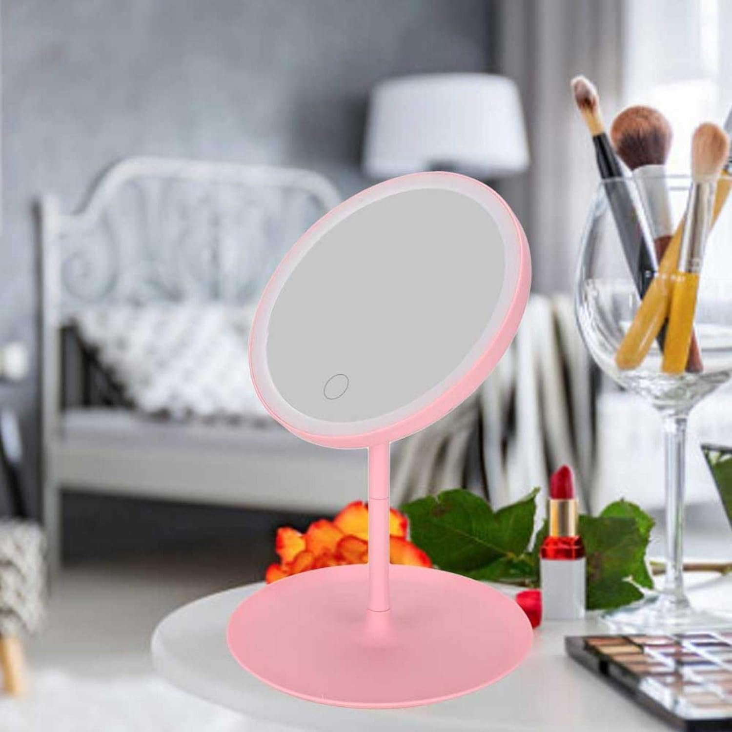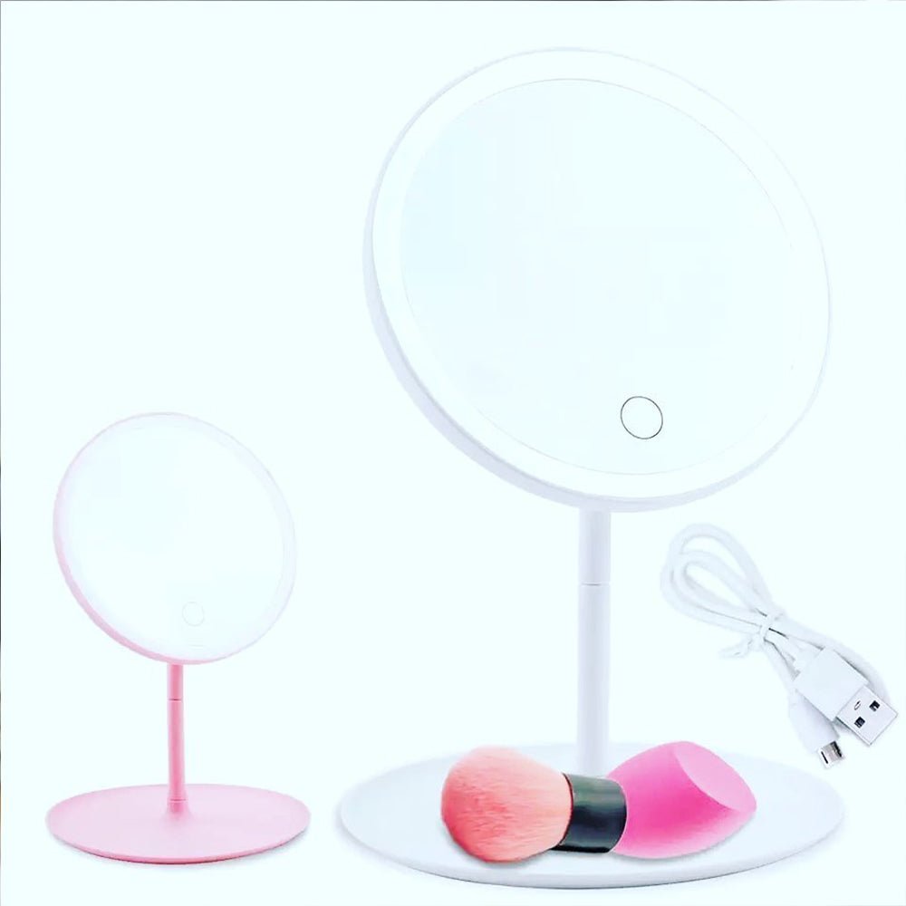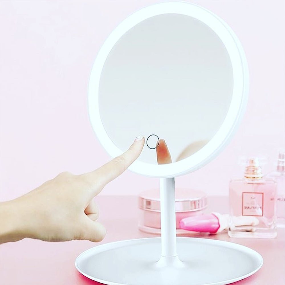 A multifunctional beauty accessory combining a table lamp, makeup mirror, and storage tray. Designed with adjustable LED lighting, a rotatable mirror surface, and a sleek modern base—perfect for grooming, studying, or adding style to your vanity or desk.