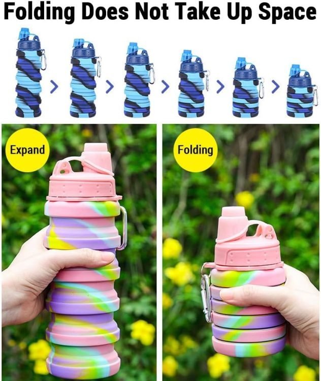 - ?With its foldable design, our collapsible water bottle reduces in volume by 50% after folding, making it compact and easy to carry wherever you go. It comes with an aluminum alloy safety clasp that can be attached to your backpack, making it perfect for gyms, workouts, offices, and outdoor activities.