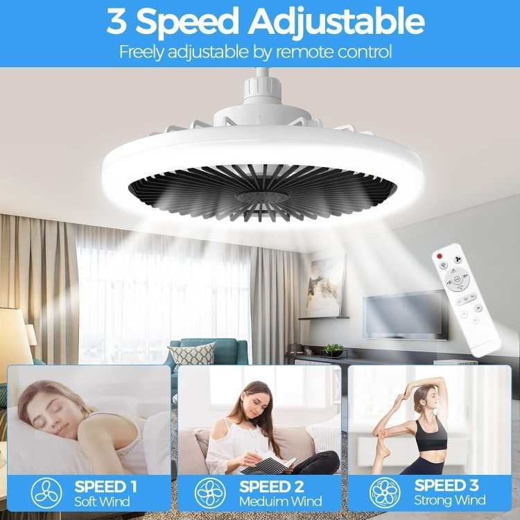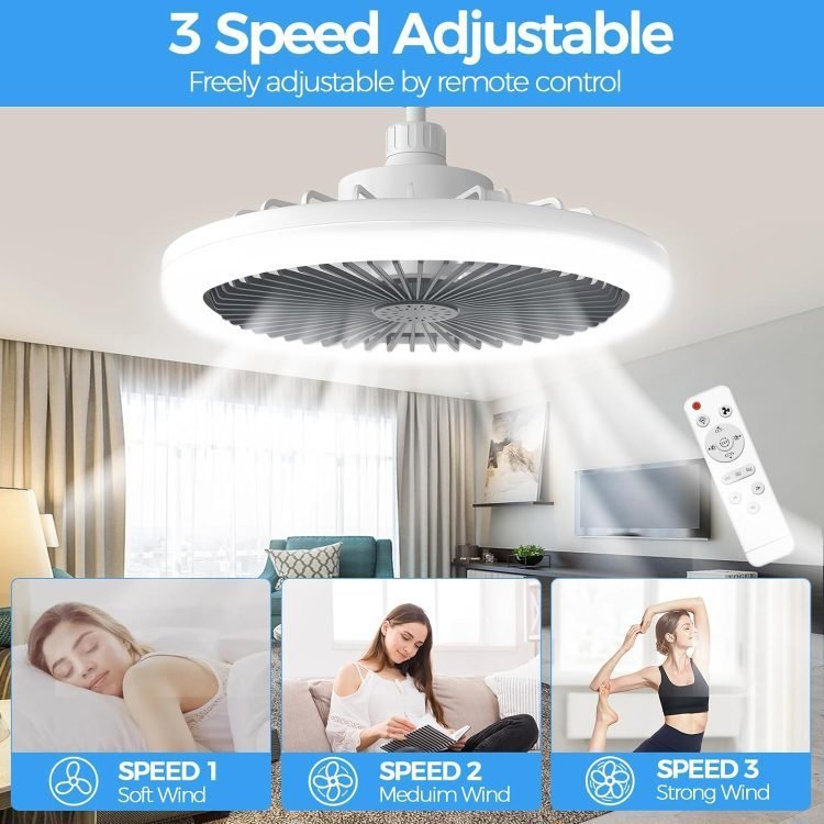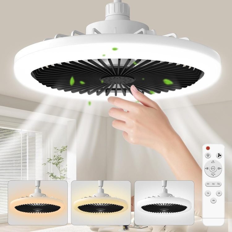 - ?Socket Fan Light with Remote – Biukis Ceiling fan with light with 3 speeds and timer function (1/2/4 hour option). Ceiling fan light is infinitely adjustable with three color temperatures (3000K-6500K): White/Neutral/Warm. You can adjust the lighting from dim to bright and switch to the most comfortable mode according to your personal preference. The ceiling fan has a memory function that will your lighting settings.