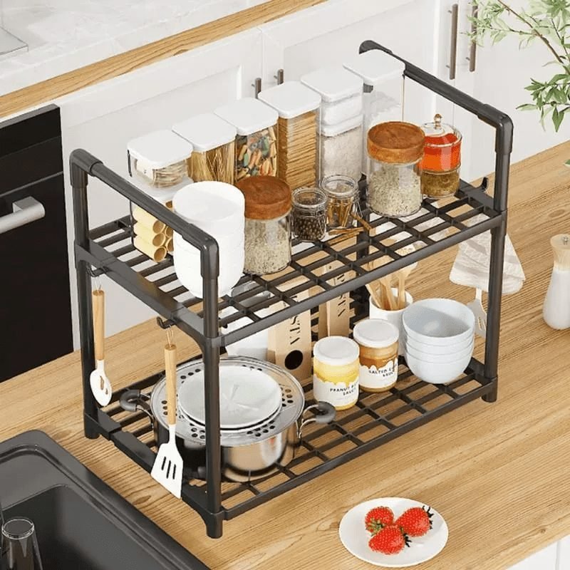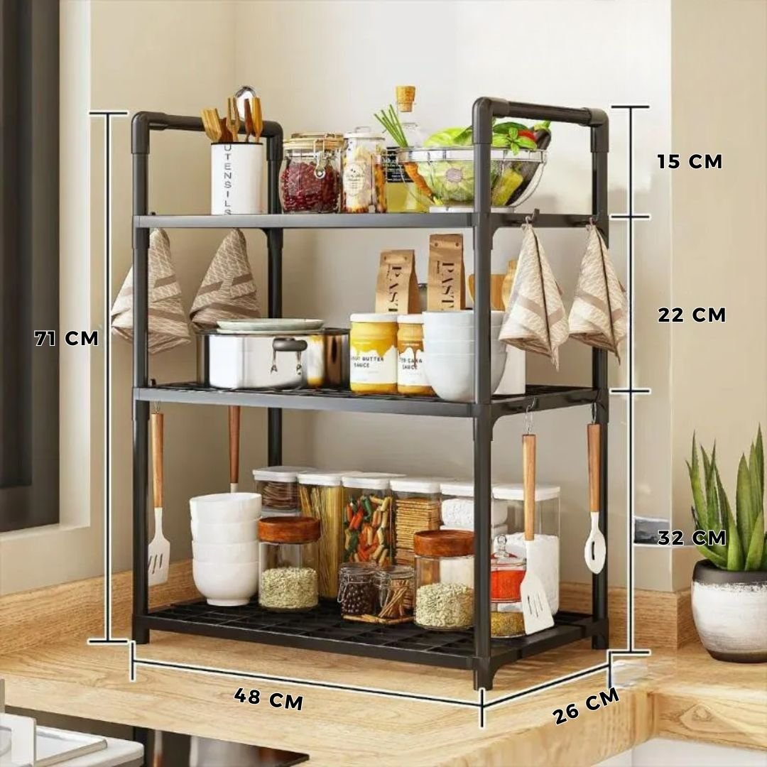 This shelf features a sleek and modern design, making it ideal for organizing the kitchen and maximizing space. Available in three layers to provide additional storage for utensils, spices, cups, and more.