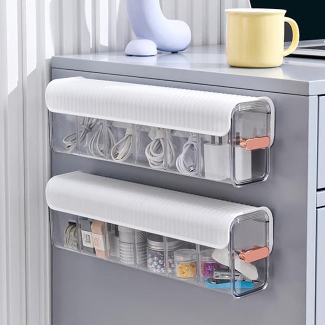 The size of this organizer box are?30 cm x 9.5cm x 8.5cm, wall-mounted design, more space-saving, which will not take up much place in your kitchen, office and bedroom.