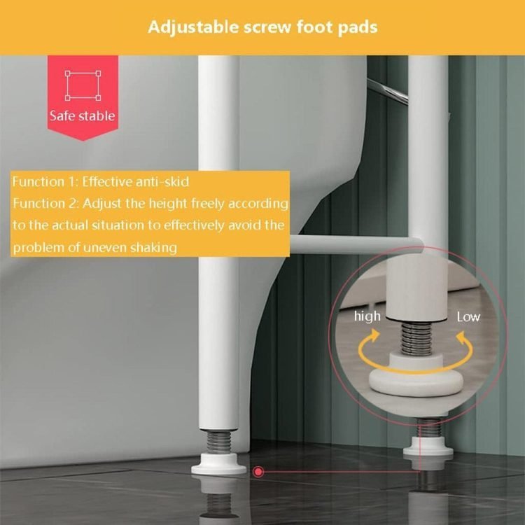 - Toilet Paper Holder and Hook: There is a Toilet Paper Roll Holder on the Side of Our Shelf. the Hooks on the Side Can Hang Towels,Toilet Brushes and Plungers to Make Your Bathroom More Tidy. Adjustable Non-Slip Foot Pads,Adjustable Screw Foot Pads,Effective Anti-Skid,The Height Can Be Adjusted at Will to Avoid Shaking